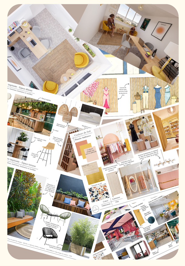 Planche ambiance : il s'agit d'un outil visuel permettant de présenter et de communiquer des idées de décoration. Elle est composée de manière créative de différents éléments visuels de décoration